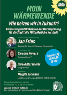 Mit Jan Fries (Staatsrat für Umwelt, Klima und Wissenschaft), Carolina Herrera (ErdwärmeDich e.V), Harald Klussmeier (Energiebrater)